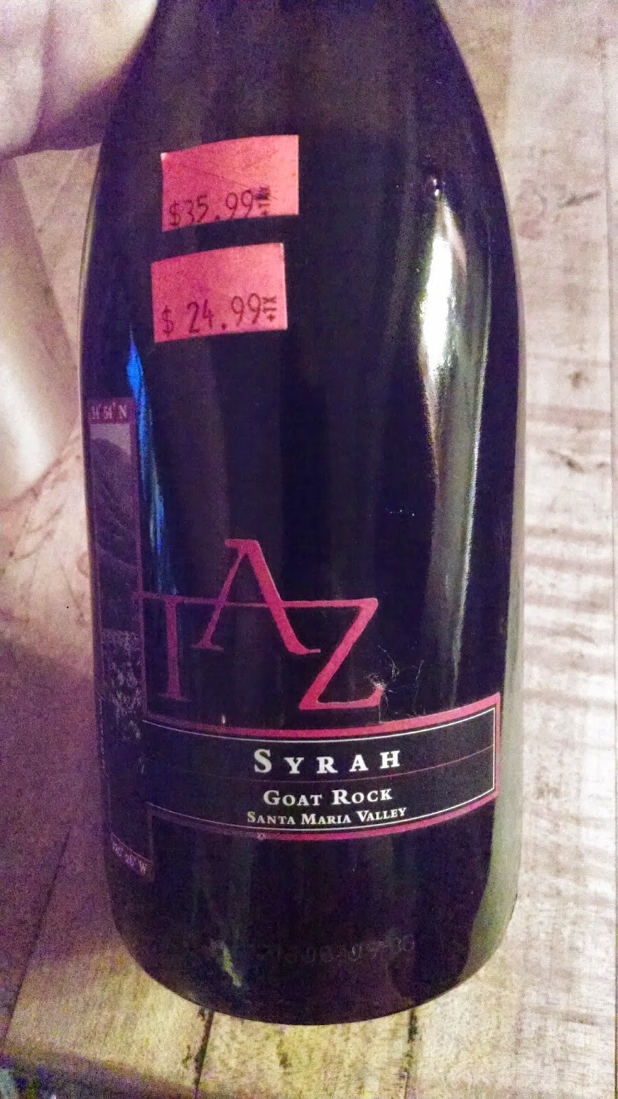 Had been really wanting to try some TAZ for a while but the price-point just made it really difficult to justify a straight-out experiment. Deep garnet, clear edges. A bit tight at first, then blossomed wonderfully. Dark, dense fruit–not too ripe. All of those amazing little burnt-rubber, herbaceous nuances which make SY wonderful if grown in the right place, picked at the right time and processed properly. I have to look up Goat Rock or ask some SMV friends, because I am uncertain exactly where or at what elevation it is. Wonder if it is on the North side up there above Cambria and Kenneth Volk (the old Byron tasting shed). Just doesn’t taste like SY from the South side of the river and valley (Lucas & Luellen, etc). No, I can’t spell Luellen. Lewellen? This wine had just a touch of age on it. Just perfect all night. LOVED it. That was yesterday. Little under half-bottle Vac-u-Vin’d overnight and tonight: Just absolutely completely totally FELL APART. Completely oxidized. No interest what-so-ever. Just GONE. Turned out to be a lot more fragile than it appeared. 14-8 <there's the problem. Solid ♦♦ wine last night. 24 hours later: ◊ I really was going to buy some more of this. Magenta will testify I said "OMG I have to have more of this!" several times last night. But sorry. Can't do it. Just too fragile.