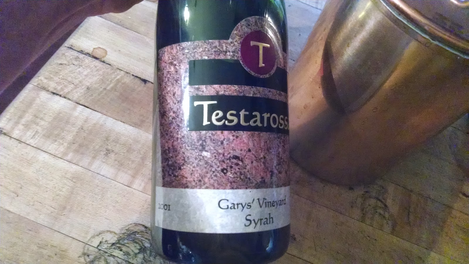 Deep bright ruby with clear edges. No bricking. Strong gym-socks and AL in the nose. The mustiness somewhat blows off, but is remains rather offensive even after a bit. Fruit is gone. But it is not a tired wine: it clearly never had fruit. I think this is my first Garys’ which isn’t a pinot. It is a bright, fresh wine–showing basically no age or polish–it just has no fruit. Attack and middle just thin fruit and overt acids and tannin. Really has nothing to crow about. Just bottled structure. If it ever had fruit, it was a monster, but something no one should purchase for laying down. 10 mins in, the nose turns to glycerine. Still no fruit. I was really looking forward to this. I can see people buying this and telling themselves how huge and wonderful it is, but frankly it just sucks. There is nothing in this wine worth tasting and probably never was. Still, it would have been interesting to taste this ten years ago. Understanding my infatuation with structure and acid, I might have fell for it. 14-6 ◊