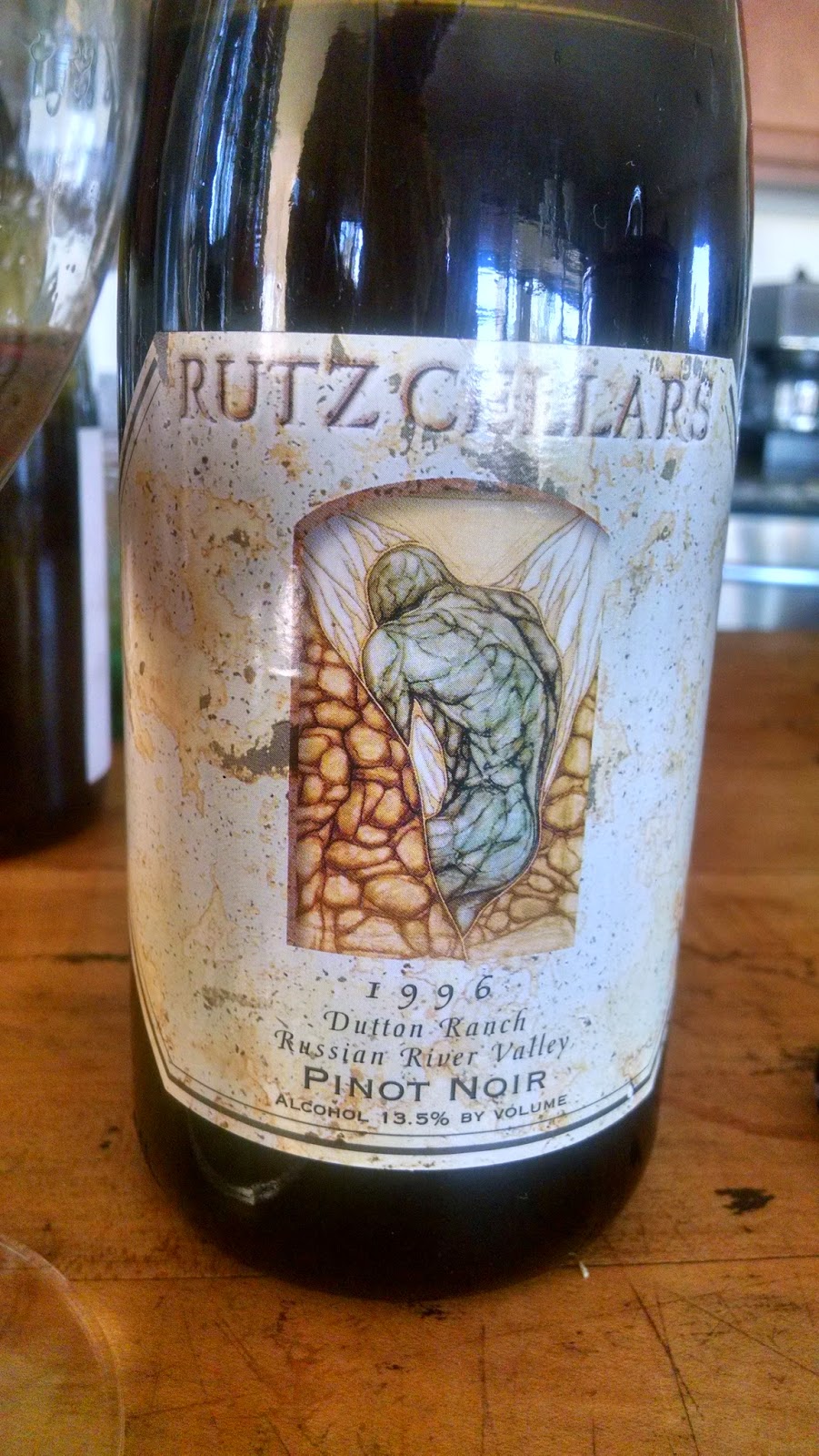 A most interesting orphan. First pour clear tawny amber. Second pour somewhat milky version of tawny amber. Fairly severe struck-match typical old pinot nose but not garish or necessarily unpleasant and backed up by gobs of wet leather, rich oak, wet dirt and yes, deep dark FRUIT. Thinnish entry but actually surprisingly fruity and bright. Subtle acidity and even subtler tannin–but both quite apparent–shockingly–but the UBER-shockingly part is the rich fruit thread constant throughout this wine. It is seriously STILL fruited. Just unbelievable in a Pinot at 18 years old. I’ve had 60$ TWO-THOUSAND-SIXES which were further ‘gone’. This thing is definitely past its prime in pure lineal voluptuousness but still amazingly enjoyable and pleases on just about every level. This is just unheard-of in New World Pinots. Is it possible for a wine to be thin and tired and at the same time deep, dusty, and sexy?!? 13-5, my dears… and I shudder to think what this would taste like if it were 14-5. I highly recommend searching out some RUTZ if ‘flash-in-the-pan’ Pinot Noir bores you. ♦♦♦