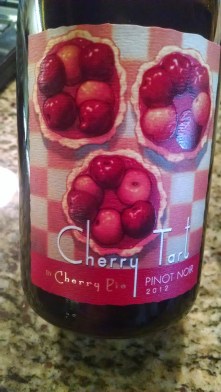 Clear, thin, bright garnet–not ruby, which somewhat surprises me, being a 2012–definitely garnet, with clear wide edges. A nice gentle ‘pinot’ skunkiness muddled with sweet oak, a touch of AL, and, well–I have no option here–dark cherry fruit. Nice and fruity, but of a dark sort–not the jammy fruit-forward-ness I was expecting–and altogether fairly balanced, if a bit meager. A nice crisp acidity wraps up the musky pinot earthiness and heads off into the direction of mild tannin and a little more AL. It is a nice, pleasant Pinot Noir which will please a multitude of palates and at 20$, you can’t be too hard on it. It fades into simple fattiness fairly quickly and I would love to find something like this for about 12.99. To me, it seems that would be a good price-point for this wine. But times have changed, and 20$ Pinot, is, well, you pretty much have to pay 20$ minimum for a drinkable Pinot these days. One could poke around on the third or fourth shelf at the supermarket or TJ’s and probably come up with negociant- or mass-produced wine which matches or betters this on one level or another, but all-in-all, it is not a terrible wine. Fairly two-dimensional, no gripping nuances or tastes which drag you back, but probably the bench-mark for an easy, 20$ Pinot quaffer. I have yet to find big brother Cherry Pie around here, but I suppose I should seek it out so I can eat crow about what an over-blown, oaky, alcoholic, Bella Glos muss I have assumed IT is. It is very interesting to see people posting about how amazing the 60$ Cherry Pie is, but then people who fall into more of a Pinot-Dork category step up and say, “Ya know… the 20$ Cherry Tart is the better wine.” and one can only assume it is for the pure Pinot thinness, nuances and acidity which gives the nod to the cheaper wine.