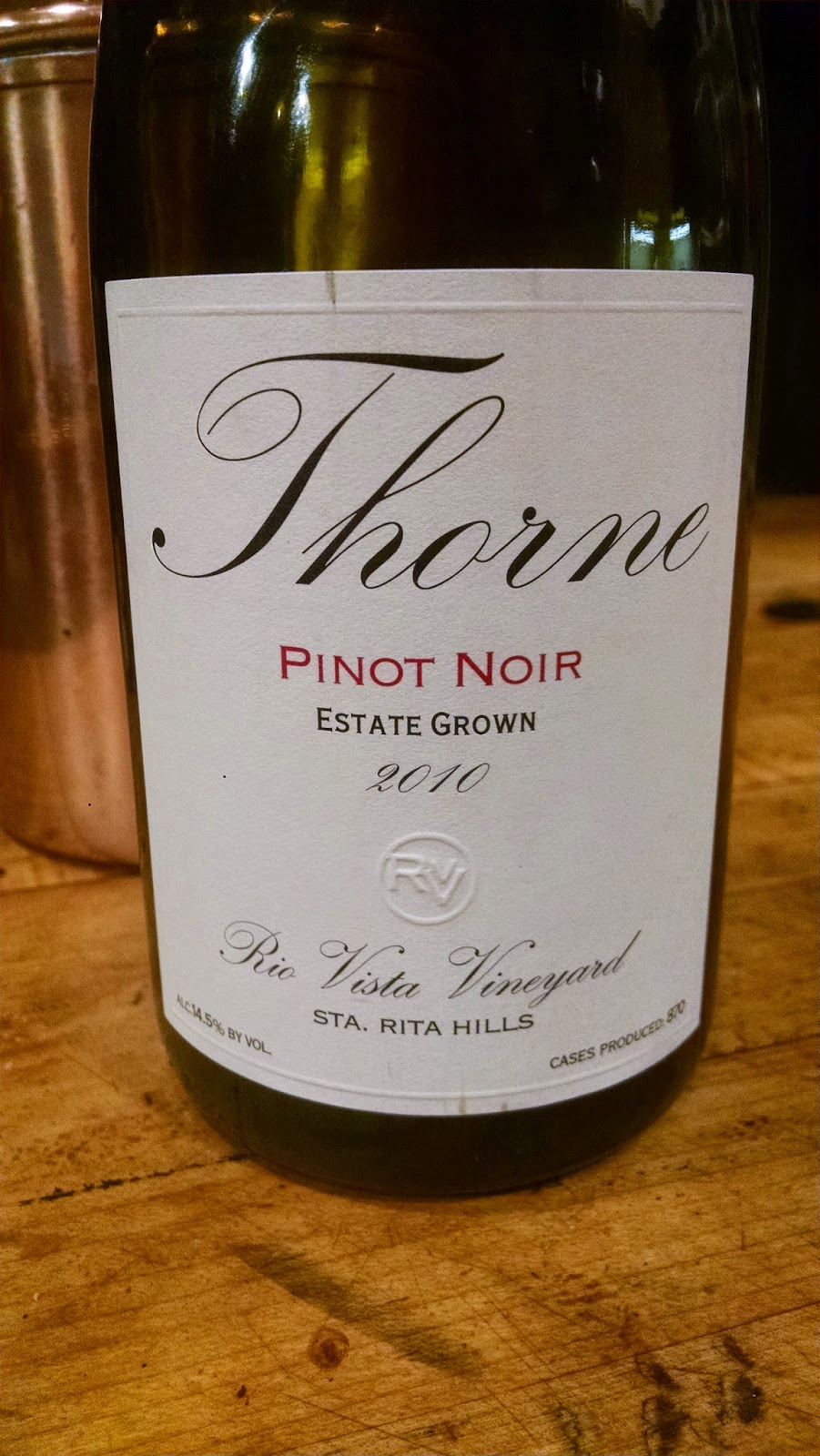 Medium-dark garnet with bricking edges.  On the denser side of Pinot Noir.  Explosive matchsticks and spice and Alcohol and glycerin-ey sweet round oak.  Wet rubber-band earthiness.  A beautiful PN nose–if not a tad over-blown.  Comes on strong in the mouth but honestly it is a lot of sweet, ripe nuances framed with spice and oak and not true pinot fruit bordered with earthiness.  Def a crowd-pleasing PN.  Finishes smooth and seamless with acids and tannin all in check behind the rich facade.  There really are no flaws to it–unless you are a pinot purist/snob, and then you will find it shallow and cloying.  A well-made wine which pleases me all the way through–despite it being a bit huge.  It’s not huge like Bella Glos huge… more huge like Riverbench huge–managing to bring together most of the wonderful things about Pinot but in a larger, riper package.  Would we call this tourist-wine?  No.  Too expensive and to obscure.  Would we call this catering to the consumer-driven palate?  Yes.  But it is super-duper yummy!  And the nose continues to please–entry and finish–long after the glass has breathed out.  One word of warning–I tasted this 24hrs open and it was a madierized, oxidized pruney MUSS–which I can *kinda* see some of in–most importantly–the colour, and also in the extraction.  Purchased at Madeline’s in Cambria for the usual amount for pinot of this consideration-point.  14-5   ♦