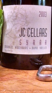 Another Jeff Cohn. Last night’s was so good and I like North Coast syrah’s so much better than… wait. Let me re-phrase that. A lot of North Coast syrahs have that cool-climate edge which make a fair number of them candidates for my palate. Better? Ok so let’s start over. Last night’s JC Fess Parker was SOOOOOO good, I decided to twist off a JC Napa just to see if it could be outdone. Again: Deep medium ruby with garnet edges. Steely nose with an alcoholic bite like an awkward pre-teen with too much poorly-applied makeup trying desperately to say something cool to the group. A certain ripe citrus, blood orange? A definite wet dock nuance. And not the plant. Dock, like, a PIER. A definite fish-scale wisp over a bed of raw walnut meats. Entry is decidedly different from last night. Instant blast of coca-cola glycerin, sharp red fruit and forward tannin. Just a TEEEEENSY bit more headed toward the pruney dark-side than the Santa Barbara. But vibrant and acidic and decidedly less polish on the tannins. I would love to have yesterday’s AL% with today’s tannin. That would be my dream car. This one has considerably more whomp but the 15-7 is rearing its ugly head. Not ugly yet, Such a tough call. This one *might* just actually last longer. Oh well who cares–I’ve got plenty of both! Shooting from the hip, I like the SB better. Hey, we could make this a JC-Marathon week. ♦