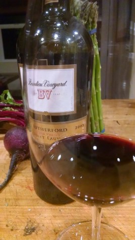 If you are a serious wine person who has been awake for the past 20 or 30 years, you have BV Rutherford stories. I feel like I have hundreds. It was probably my first experiment and exposure to actual quality Napa Valley juice and definitely my earliest exposure to a specific Napa Valley AVA. With the only possible competition being Sonoma’s Beringer Knight’s Valley, one of the oldest and longest-running AVA-specific bottles to grace supermarket shelves everywhere. Shall we talk about consistency? I go back and forth between BVruth and BerKV in ‘favorite’ and could NEVER pick one. One also has to remember–just like Mercedes used to have an S-class and an E-class, and THAT’S IT–BVruth used to be the second bottling, the only other bottling, after Georges De Latour PR. Now there are Tapestry and Maestro Reserve and the Clone-series and occasionally a few out-liers in between GDLpr and BVruth, and of course BVnapa directly below and more Maestro and Beaurouge and Red Wine before you get down to the serious boxwine-quality stuff of BVcoastal and who knows what else. I really don’t look on those shelves. For decades, there was Georges De Latour Private Reserve and Rutherford. That was it. I remember buying BVruth down in the 12$-15$ range and even today it can be found in the very low 20’s–making it a seriously long-term good deal. I started buying it in the early 90’s–I definitely wish I had more of those now–and a client gave me a 1985 as a gift in 2001 which I opened almost immediately. It had sat in a brightly-lit rack in the hallway of his house in Sacramento (25F to 105F range) for nearly its entire life and was absolutely stunning. Nearly a perfect wine. I can still taste it. I drank a fair amount of BVruth in the early 2000’s and then–with the prevalence of BVnapa and Tapestry fighting for shelf-space and what I felt was a slide in classical style, I really have not kept up–skipping many vintages completely. The last time I tried it was the 2010 vintage and was under-whelmed. I’m sorry, but as badly as some of the stalwart bottlings had slid in quality in the 2000’s, I could name a half-dozen I feel hit an additional wall with the 2010 bottling and the 11’s and 12’s reflect the same. Everything seems too over-loaded and that whole ‘perceived sweetness’ thing and anything even remotely briary or minty or tannic has gone completely away in favor of more oak. Forget any acid. The pH and AL has drifted too high and far too much emphasis has been placed on early mouth-feel. This is called the *Consumer-Driven-Palate*. BV Rutherford was designed to be a fairly easy-to-drink wine, but always had potential–if you set them aside LIKE YOU ARE SUPPOSED TO DO WITH CABS!!! for a few years you always had something amazing. It just was built that way. Now it is built for lushness and Tupperware parties right off the shelf barely 2 years after harvest. So, considerable anticipation went into opening this 2005 tonight at age 9. I am happy to report it felt like the olden days.
