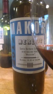 Light ruby with black-purple edges. Brett and alcohol for a split-second before heading the direction of ultra-ripe dirty cola. The alcohol remains quite passage-clearing but the figgy, thick, and stunningly ripe chocolate-cake fruit over-powers with just a faintest cream-cheese frosting providing a bright acid note. Crisp briar extremely evident alongside fine sandpaper minerality. Probably doesn’t NEED decanting–but the bouquet is so heady and borderline flabby, I want to see where it goes. You see this label *occasionally* around here. Locals recognize it and usually know the source but I have no idea where it is marketed. I would say 99% of all the MAKOR I have seen since moving to the Central Coast has been in ‘friends-n-family’ or industry cellars. An hour in and still the bouquet is almost asphyxiatingly dense with match-head, gelatin-fruit and alcohol. My first smells and tastes gave me the intention of painting it as a 3rd-growth Pomerol in a very warm year, but it has already surpassed anything remotely BDX and there is absolutely no mistaking it for anything but New World. In the mouth it still could be European. Quite funky warmish thin roundness and flat acidity with a background of bitter euc and briar. Only the nose is endowed with opulent smoke and velvet. Bright strawberry fruit across the full palate but Cali-wonk will consider it meager. Based on overwhelming nose and balance throughout, I would consider this a fabulous aging-candidate. It will always suffer from a classic Merlot middle-thinness, but a few years of rest could polish the nose and integrate it into the mouth-feel handsomely. A lovely wine now–definitely food friendly–and a 10-year cellar nominee. 13-5 ♦♦