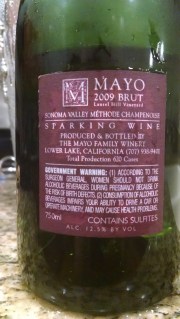 Pale pink yellow. Substantial effervescence. Heady citrus and raw pips grapple with the prise de mousse. Picked this up on a recent visit to Glen Ellen and totally hand-processed, disgorged, everything–the way I like it. So many California wineries add a bubbly to their roster for marketing reasons and contract it out because the process of making a legit méthode is so labor-intensive. If you don’t now what I’m talking about, go study up on the three or four ways to make sparkling wine and then come back. If you are not willing to do that, this blog is not for you. Go away. In the mouth acidic and spicy with intense grassiness evoking other varietals and bruised Granny-Smith alongside lovely hot bread and wet cardboard. The roasted almond nuttiness reminds you of Champagne, but the taut citrus convinces you are in California. This is vintage, and tasting very much the part, with no deceleration of bubbles. You are actually swallowing bubbles on this one. Commendations to all the people I met involved in this bottle and will look forward to many more. This is seriously something you should seek out. No indication of blend on label. 2009 12-5 ♦♦