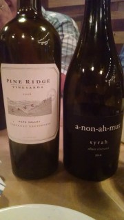 LABYRINTH Syrah. Incredible, overpowering oak and after that, a fairly simple SY. I really like Colson Canyon offerings, and this one did not disappoint but at the same time it was not anything to go “Wow” over. The last CC I had–a Brander–left me with nearly the same opinion and the one before that–a McPrice-Meyers–was equally boring. Maybe it turns out I actually DON’T like Colson Canyon as much as I thought. An interesting appell for sure, but this one didn’t do anything for me. Yummy, yes. and your typical layers of tar and spice.