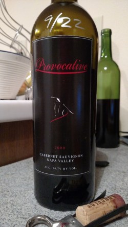 One of my favorite topics in the World: $20 NAPA CAB. Picked this up on the orphan table at Tastes of the Valleys in Pismo Beach. Typically I wouldn’t select something with a name like Provocative–I am terribly allergic to wines named with adjectives–especially ones of a suggestive nature. But being a second label and such a great deal, I couldn’t say no. This would be fun up against BV Ruth and Ber KV–the two standards by which all cheap Napa/Sonoma Cab are judged.
