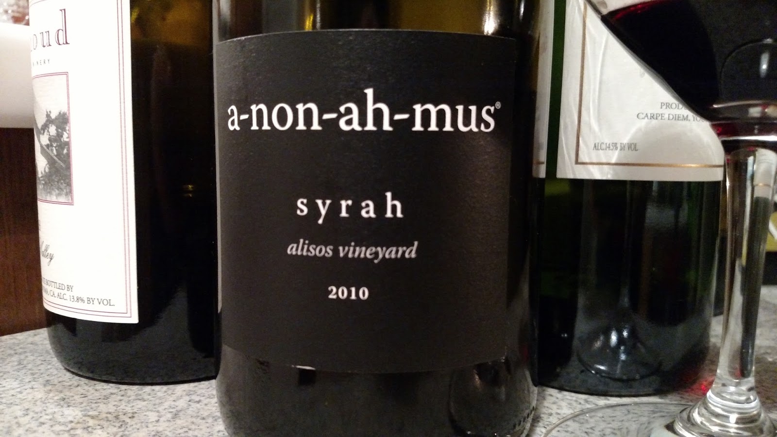 Brilliant clear medium ruby with thin pink edges. Intense minty euc and toasted briar layered over gobs and gobs of oak. Stemmy, wet-leaf sweetness, round and un-intimidating. Fell absolutely in LOVE with this guy’s Grenache, the Pinot wasn’t really my thing, the rosé interesting and the Grenache Blanc lovely. But this is my first experience with the Syrah. Definitely a crowd-pleasing style, rich and sweet in the mouth with more of that lovely oak. Fairly ample tannin barely manages to raise its head above the lushness. 2010 A-Non-Ah-Mus Syrah Santa Barbara County Alisos Vineyard 15-4 ♦