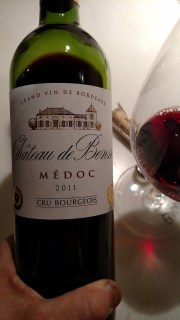 Medium-dark ruby, slightly staining. This thing smells like Merlot. Merlot and baby-diapers. Fat and ripe, with hardcore cellar-nuances. An overwhelming cassis attempts to overwhelm the incredible ripeness of the black-cherry fruit border-lining on Maraschino. Rich and full, but dull and dangerously teetering on oxidized. Not-particularly-clean cellar issues give an erstwhile homeyness to the fabulous vanilla, deep forest humus and background AL. Instantly mouth-filling, the acid an tannin take off early in this one, inundating you with the reminder this is indeed Medoc. The smokey, tarry, wet-leather, almost mildew-ey fruit puts up a good fight against the bright structure and finally fails in a finish which is thinly-fruited, but not unbalanced. I would never call this wine ‘watery’, the garden-hose cellar-issues are its only fault. 2011 Ch de Benesse Bordeaux Medoc 13-5 ♦