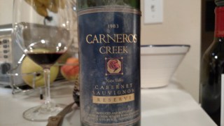 NOT gone. Bright garnet with seriously amber edges. Minty, chocolate nose with almost a bit of heat. Stemmy, vibrant and young–almost like a cheap Sonoma cab smells NOW. Incredible cassis and heavily patina’d coffee and cola. What happened to Carneros Creek? How many corporate buy-outs did they survive? Do they still exist on the lower super-market shelves? Well, they did something right in 1983 with this Reserve. Looking through the bricking swirl, it is hard to contemplate the intense mint, briar and dark cherry fruit–but it is there. In the mouth, considerably less interesting… kinda flat and flabby. A spice note kicks in mid-palate and washes everything away with slight bitterness of acid–no tannin at all. Totally drinkable and enjoyable. 1983 Carneros Creek Cabernet Sauvignon Reserve Napa Valley 12.5