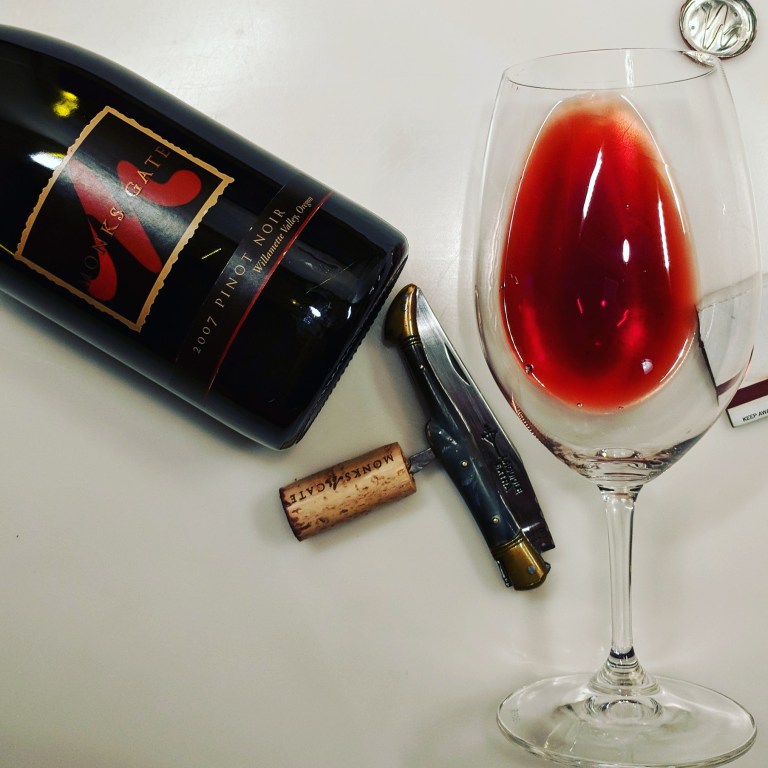Match-head and stewed asparagus, peanut butter and coriander in a package bricking hard here at nearly 10. I tasted a couple of current releases of @monksgate_vineyard at @worldofpinot recently and was impressed enough to remember I have a few stashed in the cellar. Bright black cherry and rusty blade on the tongue, a contrasting obeisance to by the nutty vegetal of the nose. Bitter and sharp in the finish–a rather beautiful Pinot.