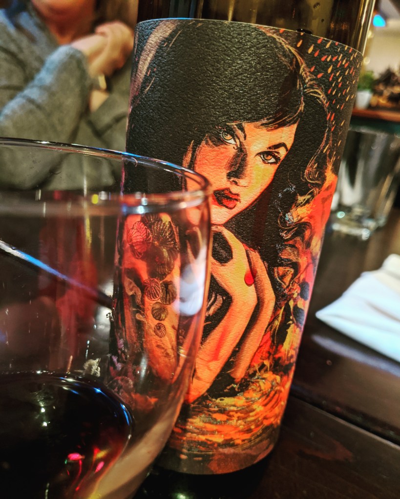 Life imitates art, and the spicy acidic that is this Tempranillo manages to pack a wallop behind that amazing label. I’ve never taken red wine to Thai before, but our Chinese place has suddenly gone take-out only so headed up the street for some curry without my typical riesling or gewurtz sidekick. Figured if anything could cut it, this temp could. And I was not wrong. It worked perfectly with everything. A brilliant wine.