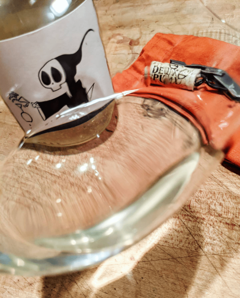 In the mouth, delicate and soothing, tiny bits of blueberry and strawberry smoothing down the green-apple acidity. Almost spritzy-feeling, it is the lightest, brightest white you have had in a long time, charming and refreshing, the supple roundness of the middle bites a little in the corners, growing to Vit. C abrasion where you might think tannins would lurk. I can’t stress enough how important it is to drink this wine at a proper 55-60 degrees, below that the flavors wash out to numbing acidity, though above that there is far less danger of awkwardness–though it takes on considerably more *minimalist wine* tendencies.