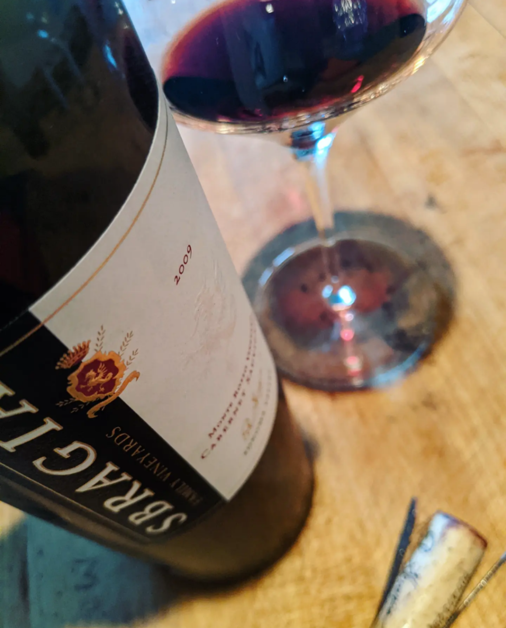 Jesus, what a beautiful cab. I honestly didn’t know who Ed Sbragia was until he launched his own label–eventually leaving Beringer–in the early 2000’s. I fell in love with his wines instantly, and have visited the TR several times. I don’t have to explain to readers of this blog the sort of vineyard relationships someone of his caliber and history MUST have in both Napa Valley and Sonoma. And the by-lines of the labels and quality in the bottle reinforces this. I keep a smattering of them in my cellar, and this 12YO Monte Rosso called my name from its dusty shelf tonight. Thick and dark, the maroon core gradually morphing to ruddy brick at the rim. A nose to absolutely DIE for: perfume so heady, dirty, composty peat churning, the candied elixir of beautifully-aged cab from an iconic Sonoma spot proudly flying the black-cherry flag, with plum and peach and bruised blood-orange inspiring all points of light. Nutty and decadent, saddle and rock-road plumes add edge and savory spice to the bouquet.
