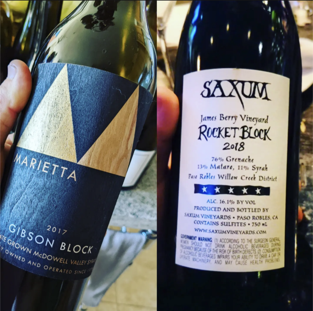 Interesting juxta between two big reds last night… one obviously 3 or 4 times the cost and perceived availability, and produced 4 or 500 miles apart in California. One from the warm, exclusive Westside of Paso on fairly young vines–one from serious old-vines in chilly Mendocino. Both MASSIVE, one from proper Syrah massiveness: packing finesse and complexity in the tannic cracks; the other from predominately Grenache–but in the decadently-macerated and stupidly-ripe steamroller style of that variety Paso is famous for and #winebro craves. While neither are particularly low-alc, those in the back rows don’t even need to read the label to guess the kind of proof the GSM packs.
