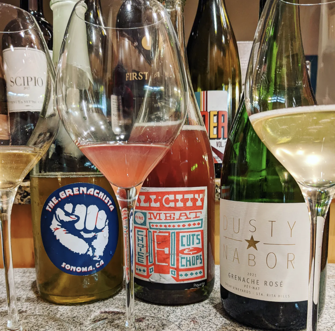 Dusty Nabor’s 2021 Grenache Rosé from the marvelous Spear Vineyard in Santa Rita Hills is his freshman effort, and it shows elegant and clean in packaging AND in the glass. Hardly any sediment, clean and foamy on pour with zero following streams. Light yellow, slightly opaque, a toasty nose heady with effervescent petrichor, yellow-pages and pear/melon. Extremely Mott’s and Martinelli’s in taste–but NOT *cider-y*. The apple rich and sweet, filling a body chewy in texture with points of acid prodding it toward a round, full finish thick with ripe fruit and bitter herb. 13.0 ABV