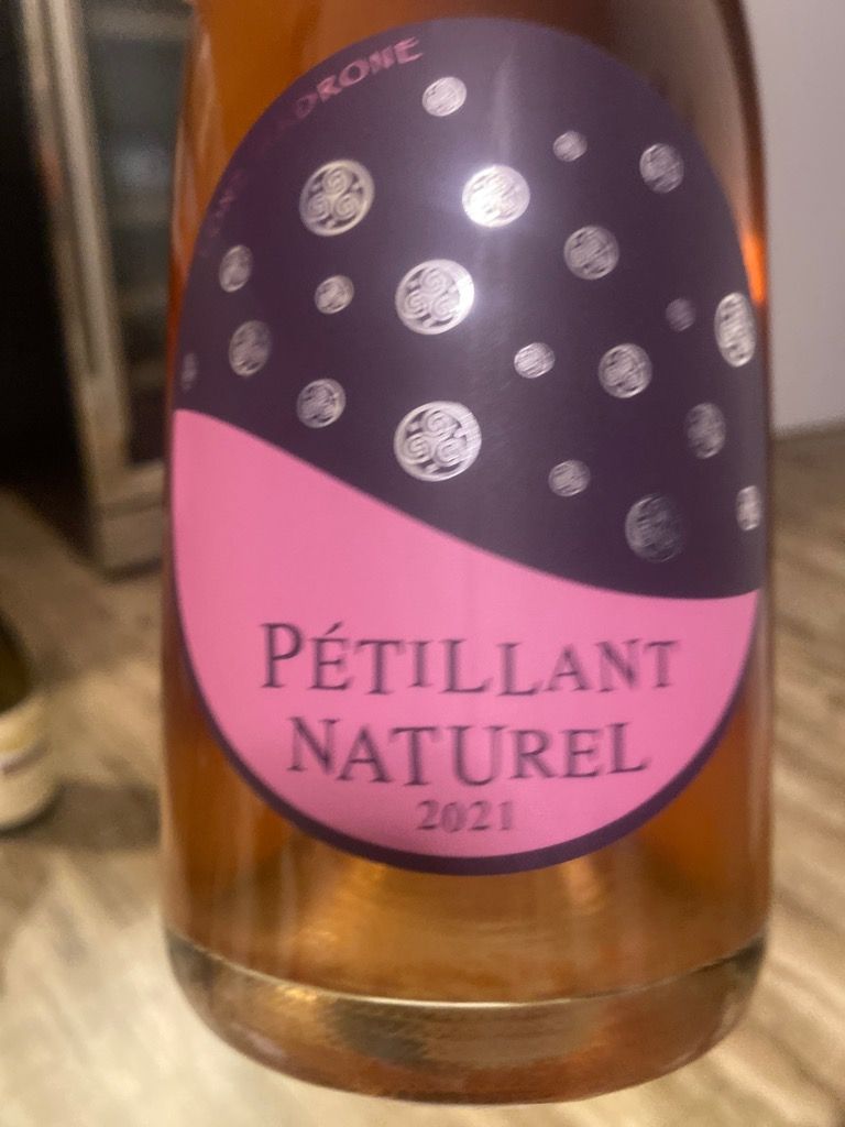 Opening this caused me a new ponder: WHY don’t more people make pet-nat out of plain old rosé??? Maybe too dry? But you don’t have to make the base wine that way. It’s always Grenache Blanc, or Sauv-blanc or Viogner, Malvasia, Cab-franc or whatever. And yet the color and purpose of this wine is simply natural from first pour. Opaque onion skin, the amber–in classic fashion–FAR ahead of the pink. Removing the crown-cap caused a bit of surprise, carbonation surging out of the bottle as happens fairly regularly with this style. NEVER open a pet-nat in a place where accidents can’t happen! Calm, dry and relatively un-fruity in the nose–no cloying fruity aspects of any of the varieties mentioned pops out, instead just a round, cidery melon and pear elegance, perhaps a touch of strawberry.