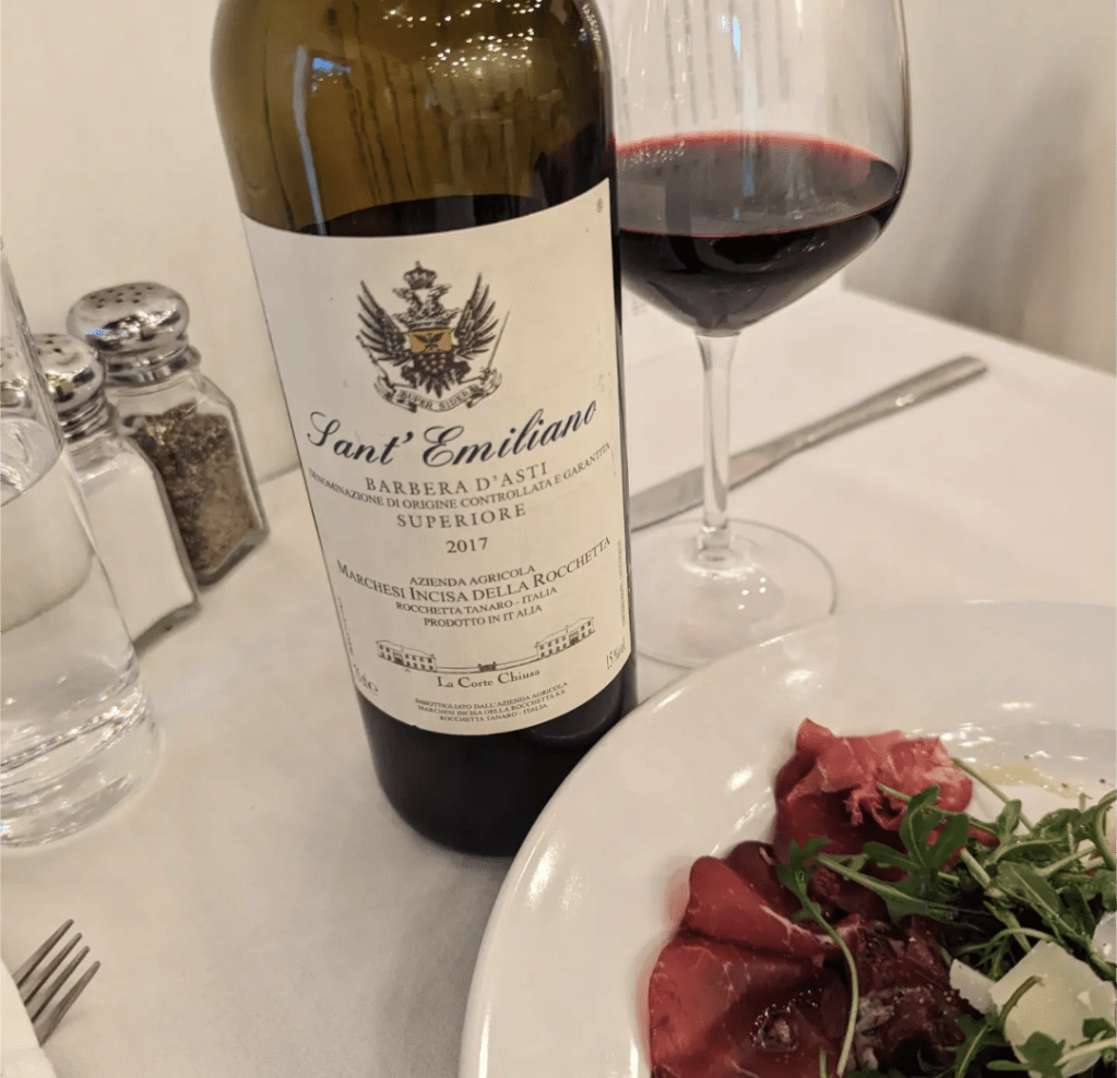 A beautiful, spicy pick off an all-Italian list tonight–the regular Barbera d’asti was 2020 and for $10 more, an extra 3 years and “Superiore” seemed a wise pick. Luxurious, musty nose and near-black body with slightly-bricking rim. The fruit heavy with cinnamon and nutmeg, boiled down into decadent berry and sharp briar. Everything screams dense concentration in the bouquet, and with a variety of antipasti and creamed dishes, went perfectly.