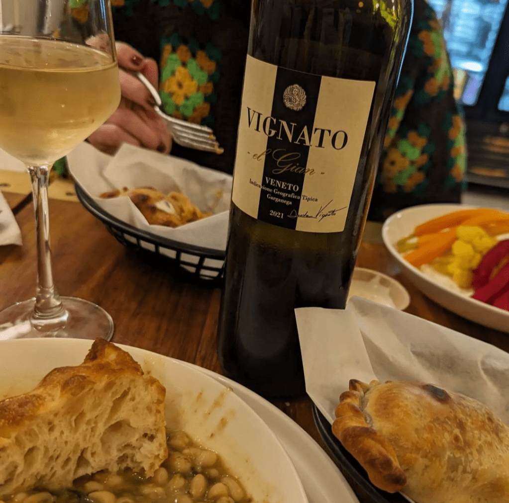 Not the wine I ordered, but it was loud and it’s doing quite fine and didn’t have the heart to send it back. Veneto in the howse. Beautiful stuff with emoanadas and beans & greens and beautiful bread.